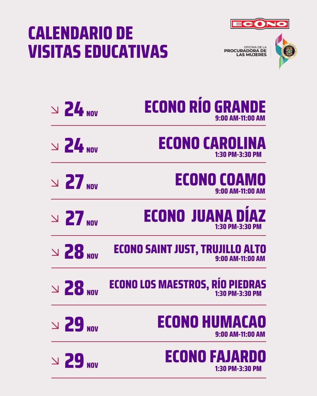 De igual forma, la campaña educativa también será integrada a Radio Econo, enfocada en que las personas identifiquen las señales de la violencia y cómo solicitar servicios de ayuda a través de la Línea De Orientación A Víctimas De Violencia Doméstica de la OPM, 787-722-2977. Como parte del calendario de eventos, personal de la OPM adiestrará en materia de violencia de género a empleados de las oficinas centrales de Econo, así también educadoras de la Oficina visitarán tiendas en áreas identificadas para llevar orientación y servicios directos a la comunidad. Estas visitas a tiendas del supermercado se llevan a cabo como parte de los 16 Días de Activismo Contra la Violencia de Género, una campaña internacional a la que se une la OPM, dirigida a sensibilizar, así como promover cambios de conductas sociales para prevenir y erradicar la violencia contra las mujeres y las niñas en todas sus manifestaciones, y que las personas entiendan que la violencia es un problema social y de salud pública.
