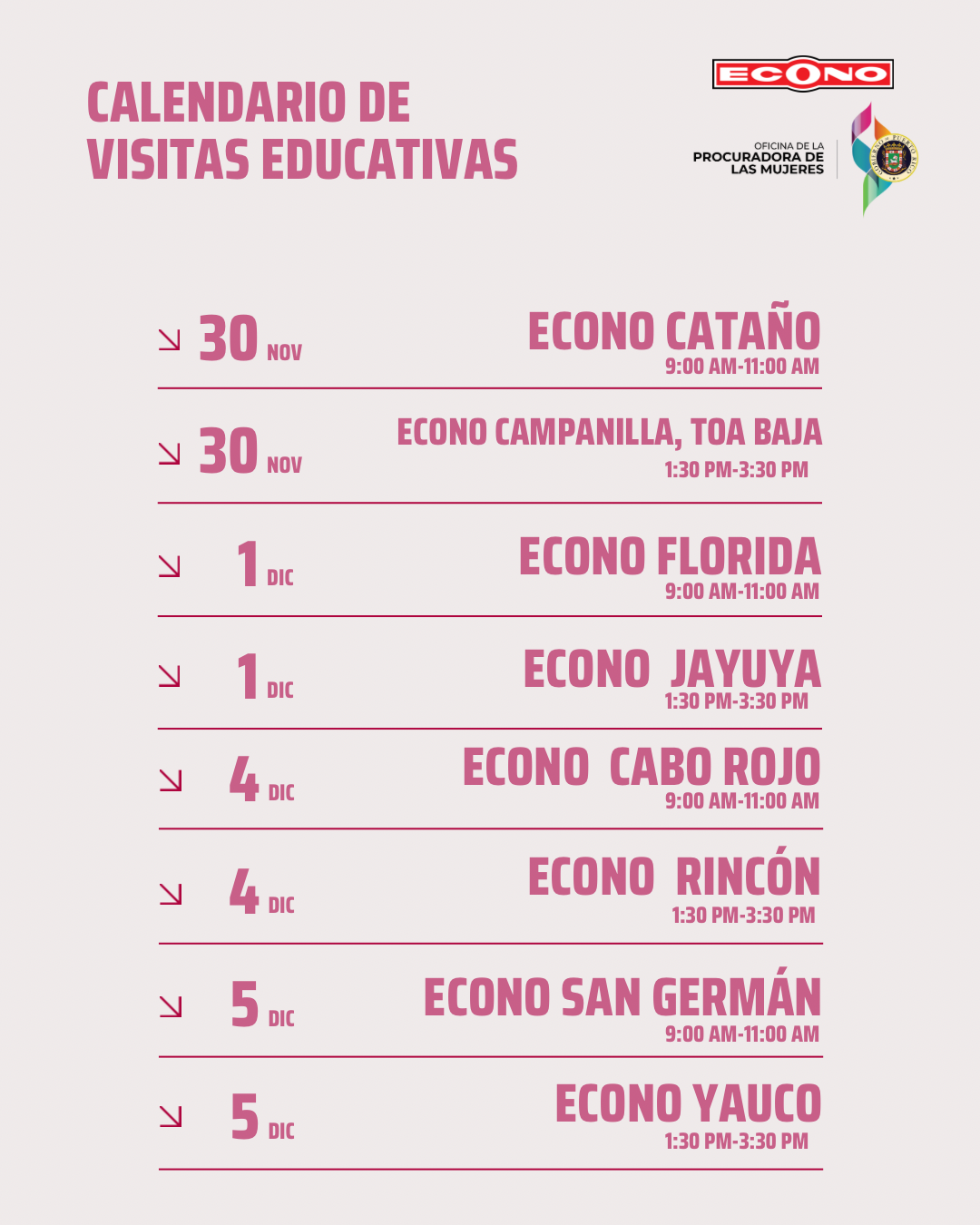 De igual forma, la campaña educativa también será integrada a Radio Econo, enfocada en que las personas identifiquen las señales de la violencia y cómo solicitar servicios de ayuda a través de la Línea De Orientación A Víctimas De Violencia Doméstica de la OPM, 787-722-2977. Como parte del calendario de eventos, personal de la OPM adiestrará en materia de violencia de género a empleados de las oficinas centrales de Econo, así también educadoras de la Oficina visitarán tiendas en áreas identificadas para llevar orientación y servicios directos a la comunidad. Estas visitas a tiendas del supermercado se llevan a cabo como parte de los 16 Días de Activismo Contra la Violencia de Género, una campaña internacional a la que se une la OPM, dirigida a sensibilizar, así como promover cambios de conductas sociales para prevenir y erradicar la violencia contra las mujeres y las niñas en todas sus manifestaciones, y que las personas entiendan que la violencia es un problema social y de salud pública.